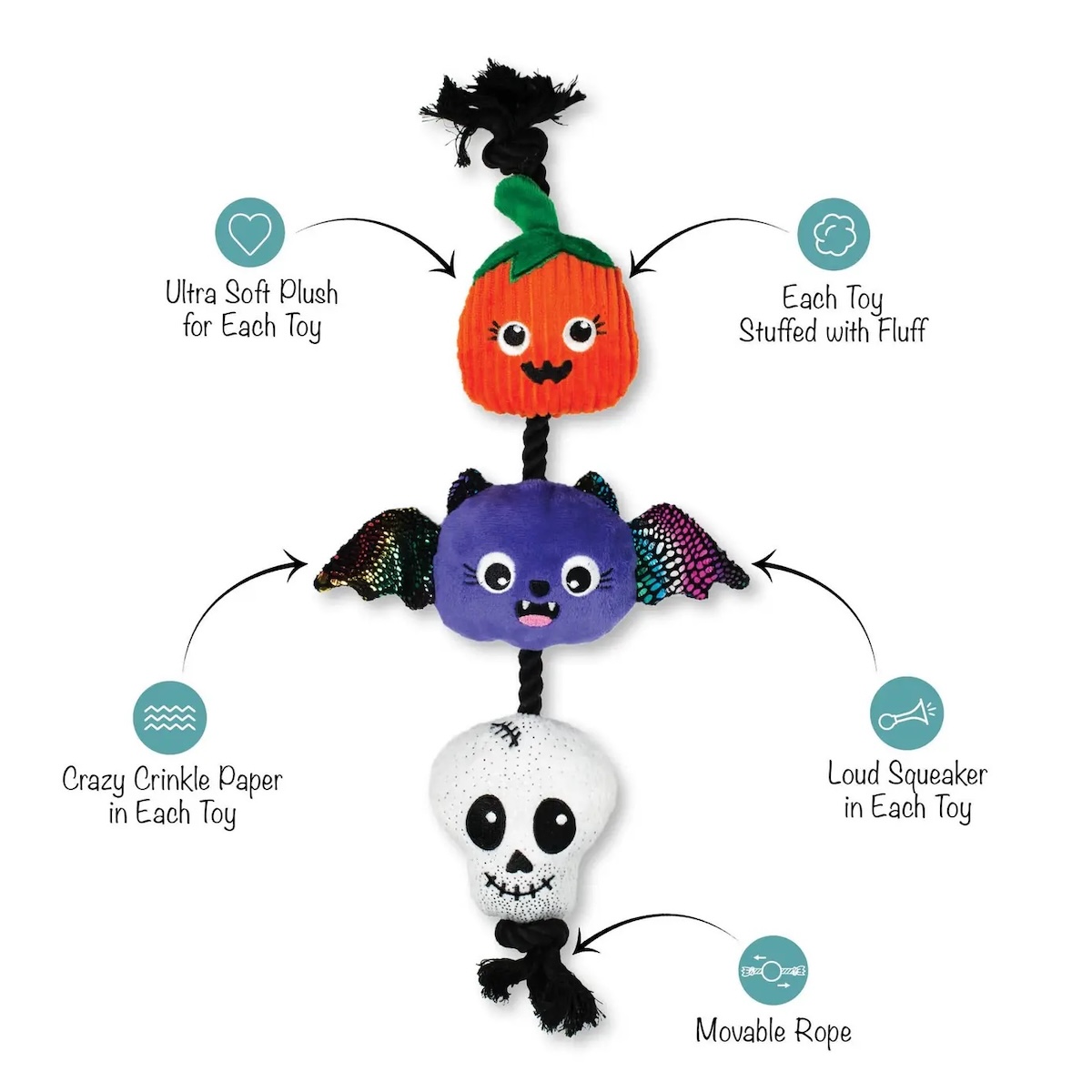 Ein bisschen süss, ein bisschen gruselig – dieses Spooky Trio sorgt für jede Menge Holloween-Spass! Ausgestattet mit drei lauten Quietschern, knisterndem Knitterpapier und einem ziehbaren Seil mit Schiebefunktion wird jeder Spielmoment zum fröhlich-gruseligen Abenteuer.